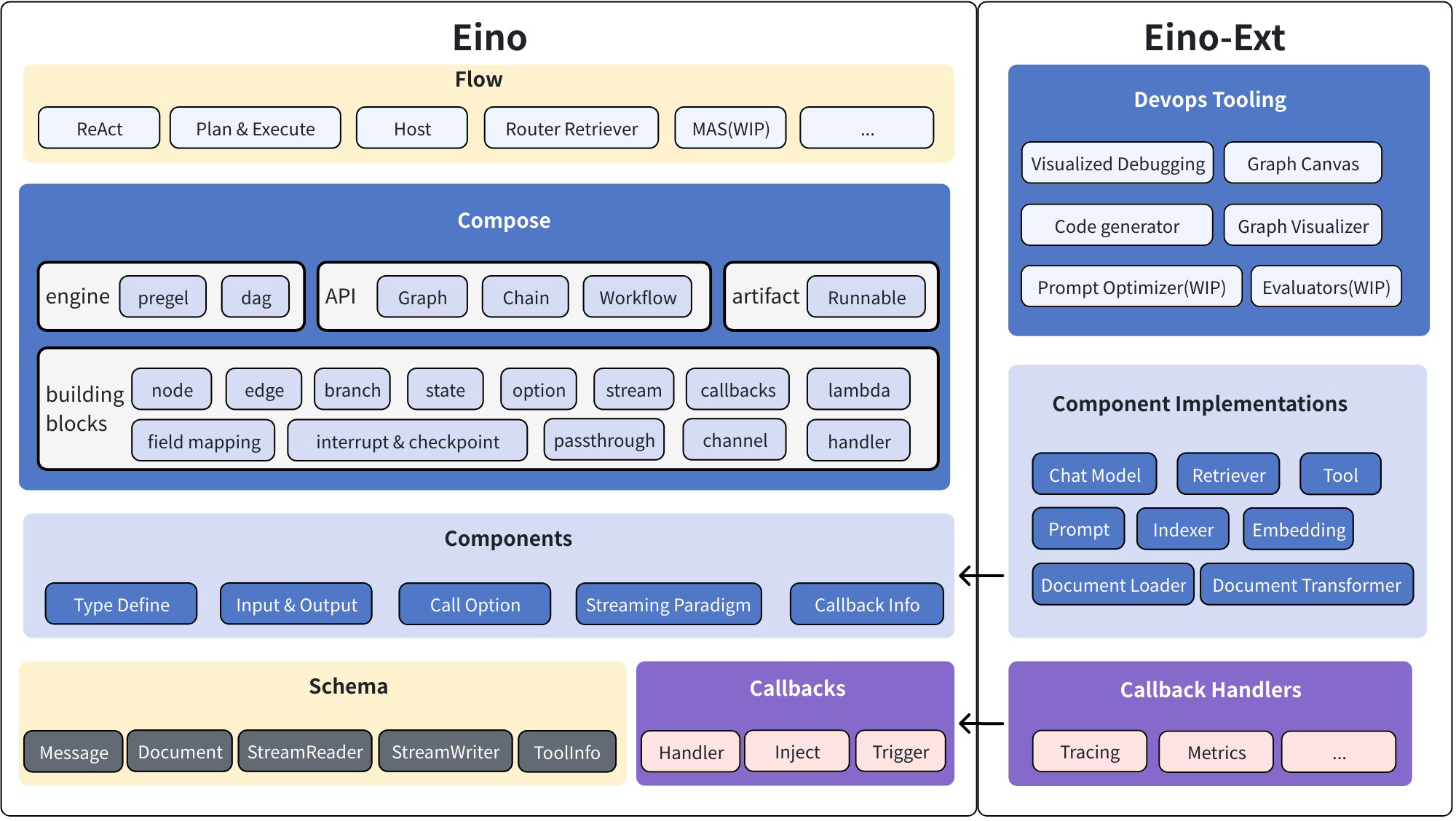 - EinoExt: Component implementations, callback handlers, usage examples, and tooling such as evaluators and prompt optimizers.